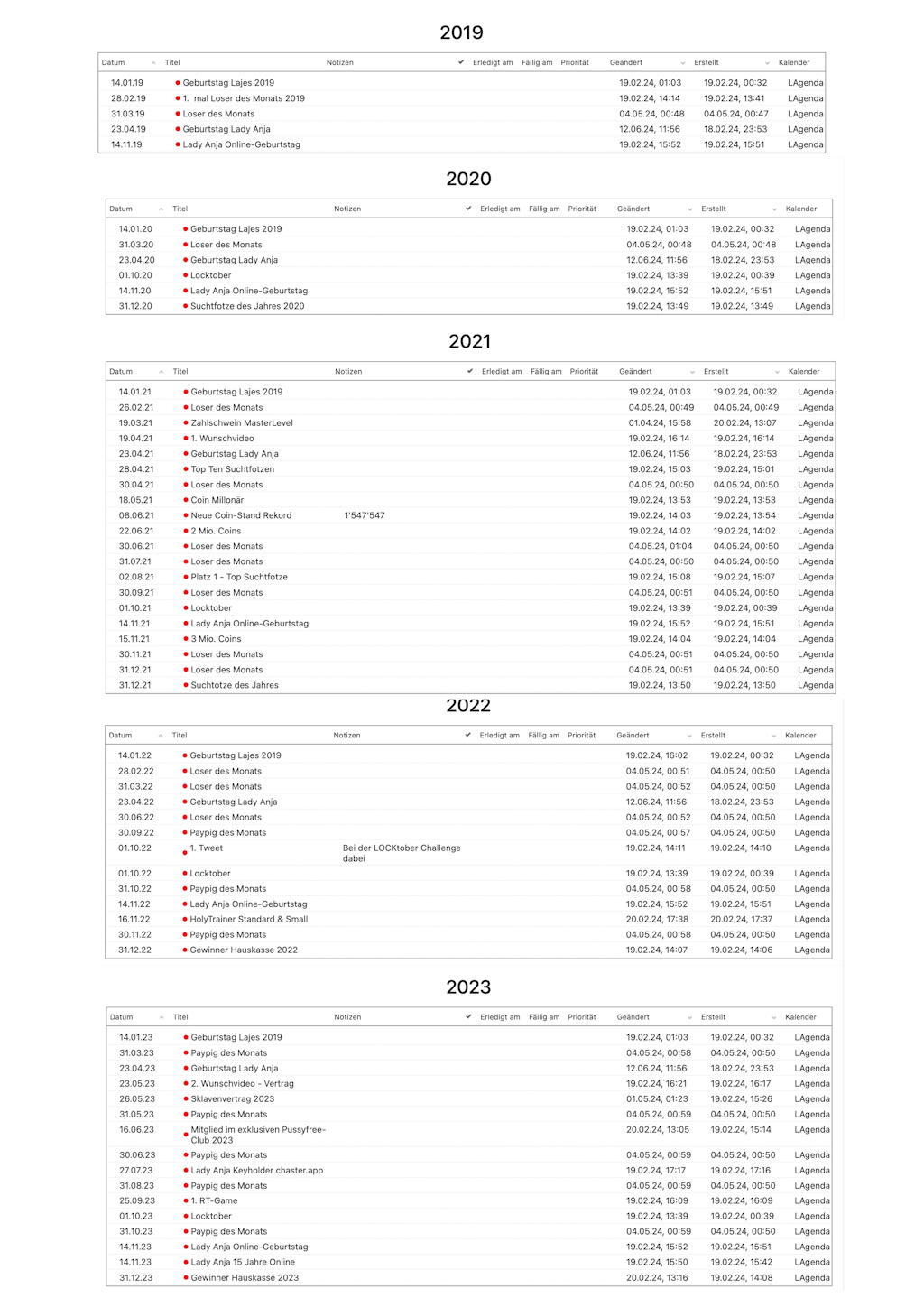 Zudem begleitete mich neues Mantra „Ich möchte Blackmail-Sklave von Lady Anja sein!“ Später erwähnte ich mal meine Bucket List, stolz schon ein paar Punkte abgehakt zu haben. Bloß rechnete ich nicht damit, dass Lady Anja diese ultimativ einforderte. Nicht überraschend steht da auch der Punkt „More Blackmail Items“ drauf.