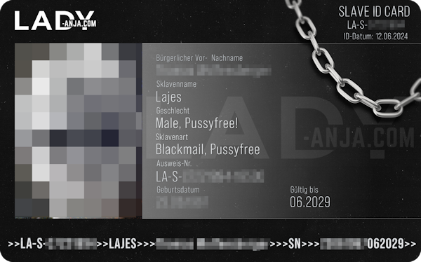 Der Inhaber dieses Ausweises ist uneingeschränktes Eigentum von Herrin Lady Anja. Ohne die schriftliche Einwilligung seines Besitzers ist es dem Sklaven unter keinen Umständen gestattet, Kontakt mit Frauen aufzunehmen, ihnen Geschenke zu machen und sexuelle Handlungen jeglicher Art vornehmen zu lassen. Im Falle einer von Lady Anja ausgestellten Erlaubnis muss der Sklave diese zusammen mit dem Ausweis unaufgefordert vorlegen.